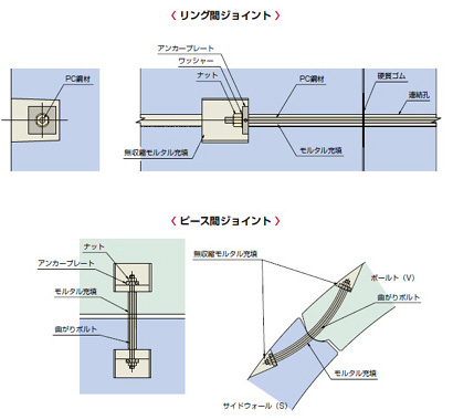 各部材の接合方法は、下図のジョイント構造とし、サイドウォールとインバートは現場打ちコンクリートにより一体化を図る構造となります。